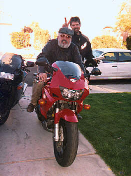 Here's Ron E. astride his new love, or at least his new LUST. Yes, that's Phil just behind with those 'rabbit ears'. He'd spent just a bit too much time in the desert sun this particular day (Sunday, after the races). The VTR was an impressive bike. I fully expect- ed to be uncomfortable after a few miles of the Phoenix metro 'slab', but was pleasantly surprised by Stormy's ride and ergos. When Axel stole the VTR on Sunday morning, I was forced to take Lynn's lovely VFR. Much to my amazement, I wanted Stormy back. Then there were those HOOLIGAN pipes.... |